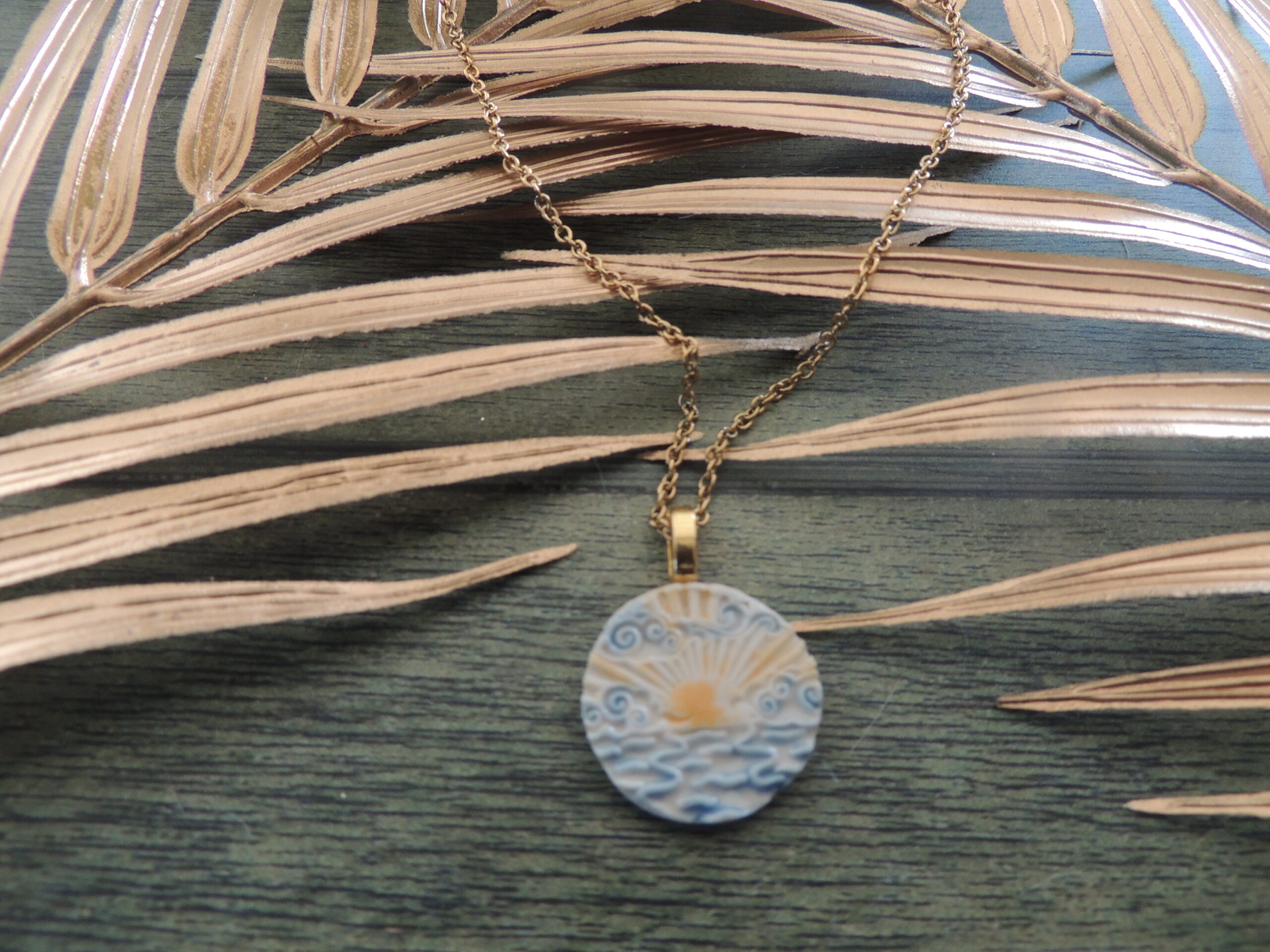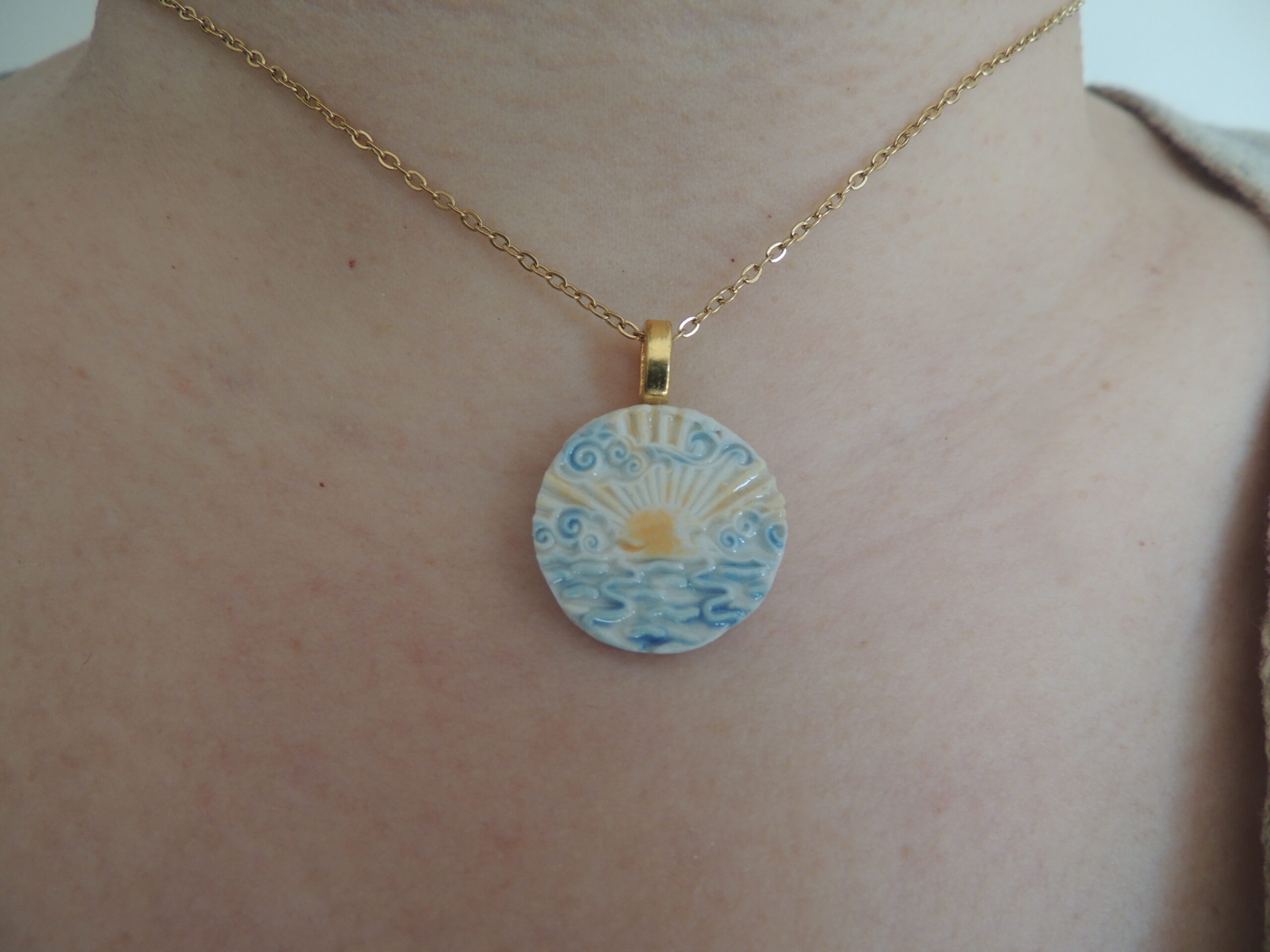 Pendentif en porcelaine emaillé avec bélière acier inoxy/dable plaqué or 18 carats avec collier maille ovale laiton plaqué or origine Europe sans nickel ni plomb ni cadium